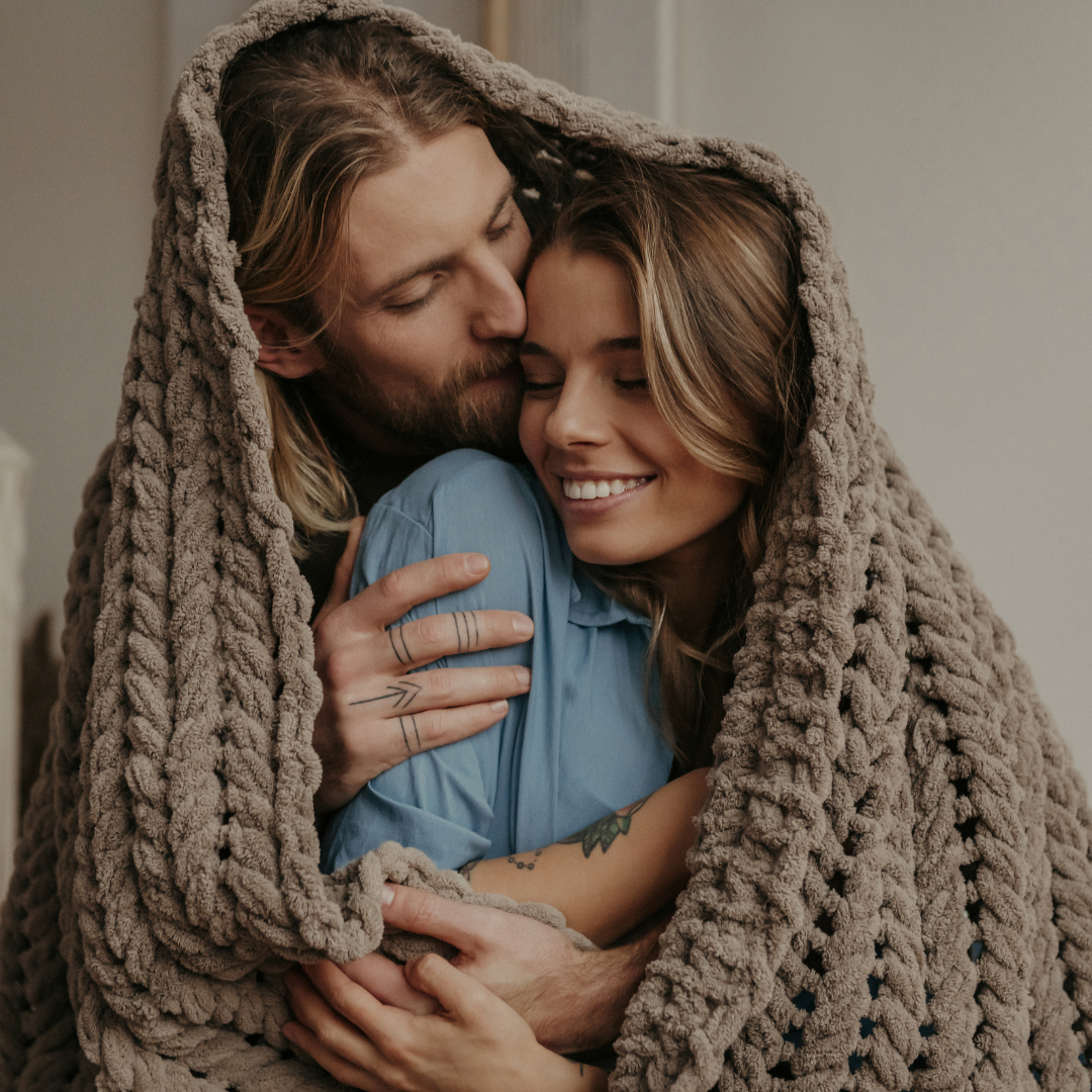 Grab your biggest sweater or your comfiest blanket and wrap yourselves tightly together. This makes for such a romantic, sweet couple photo since you’re cuddled up. This idea works beautifully for fall or winter romantic couple photos.